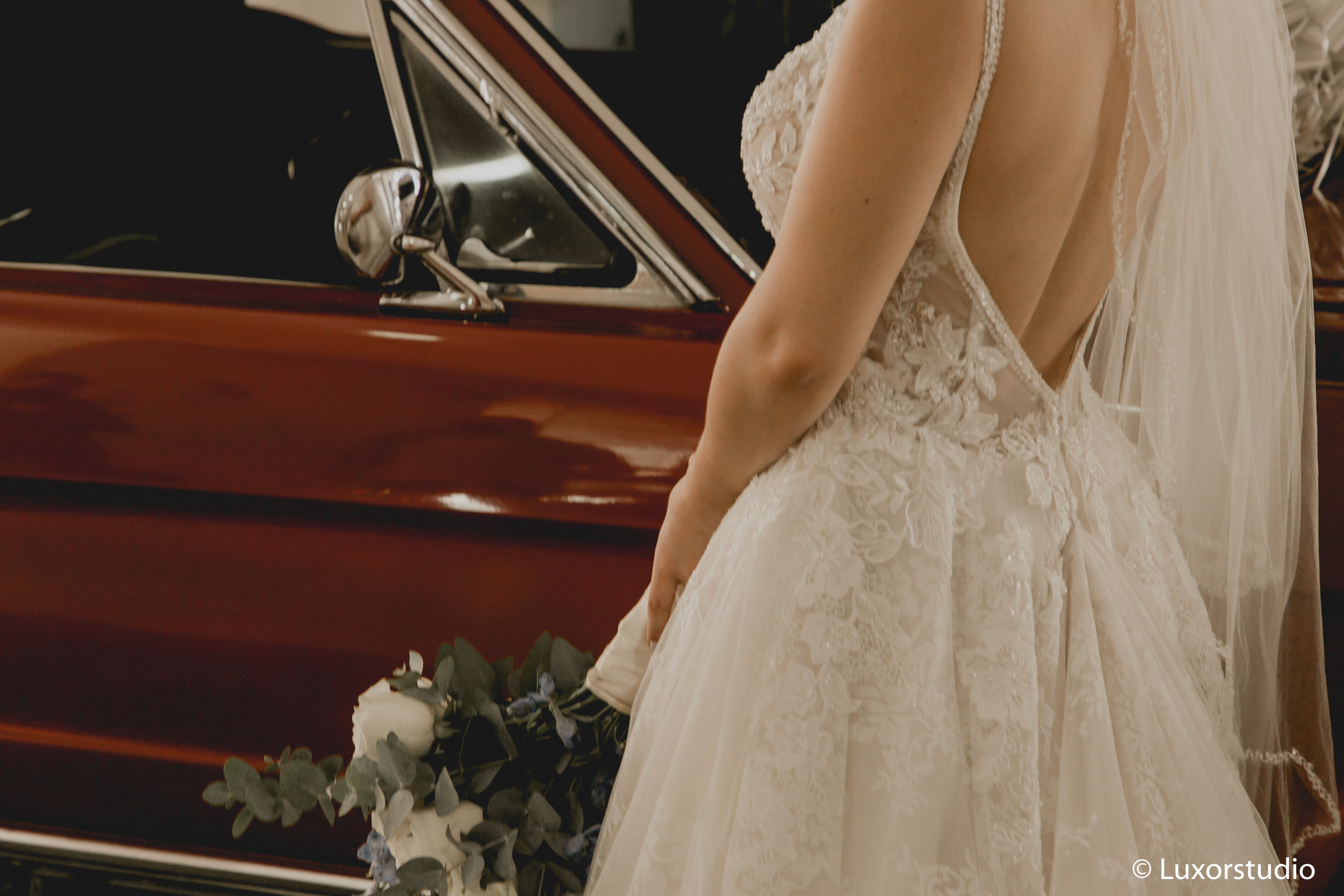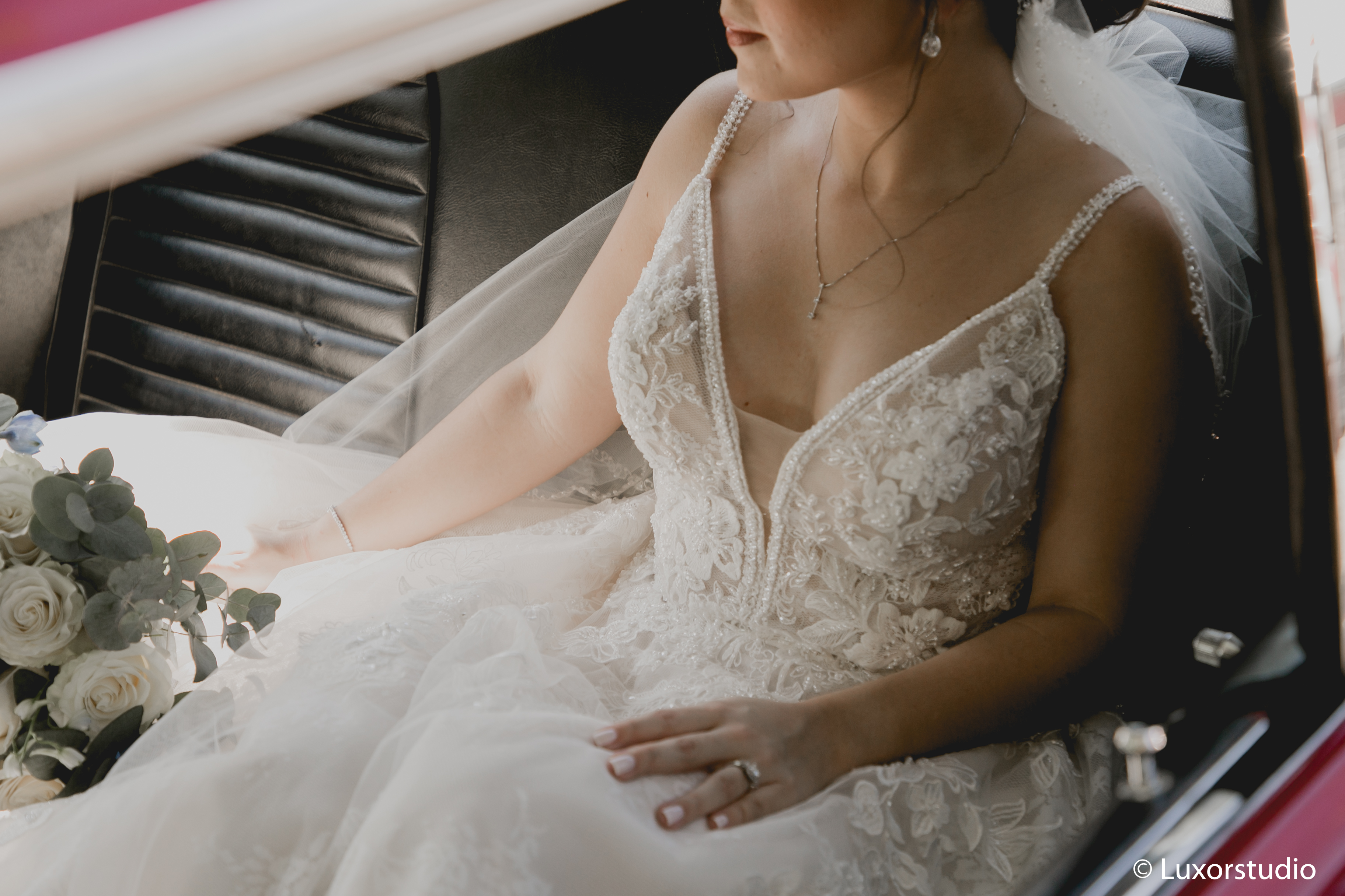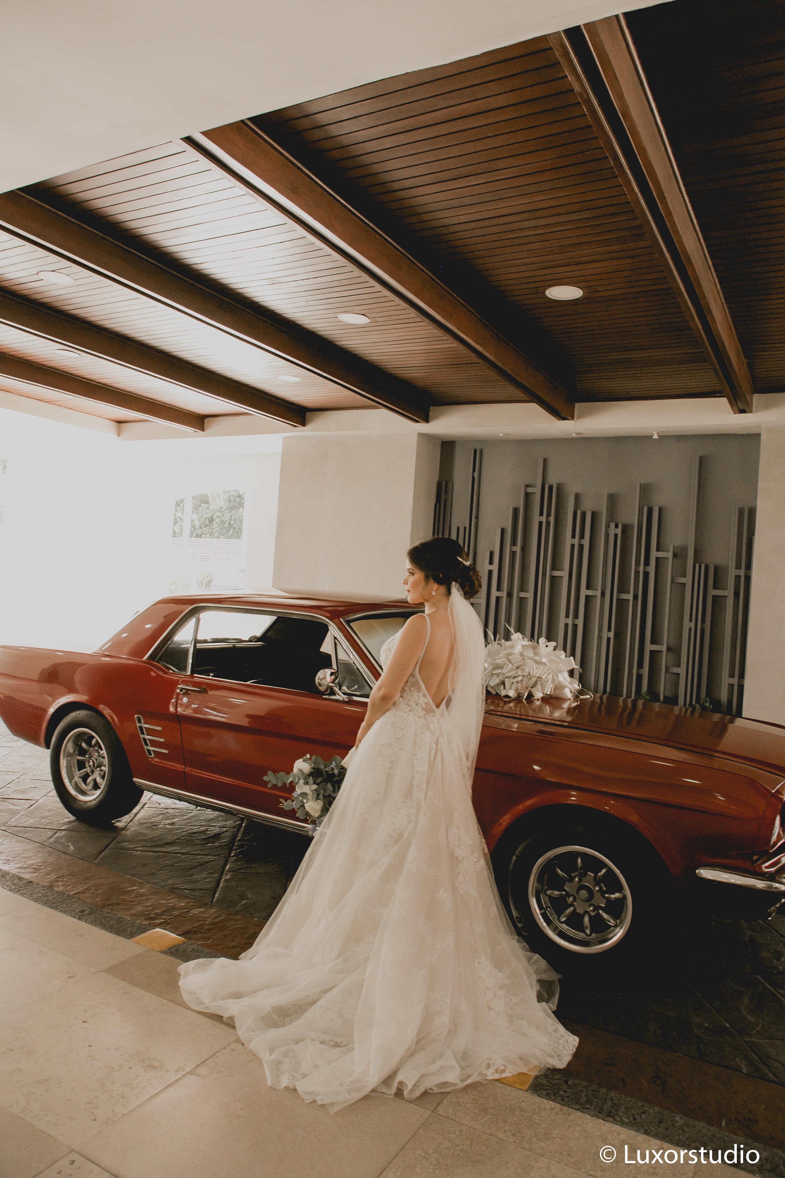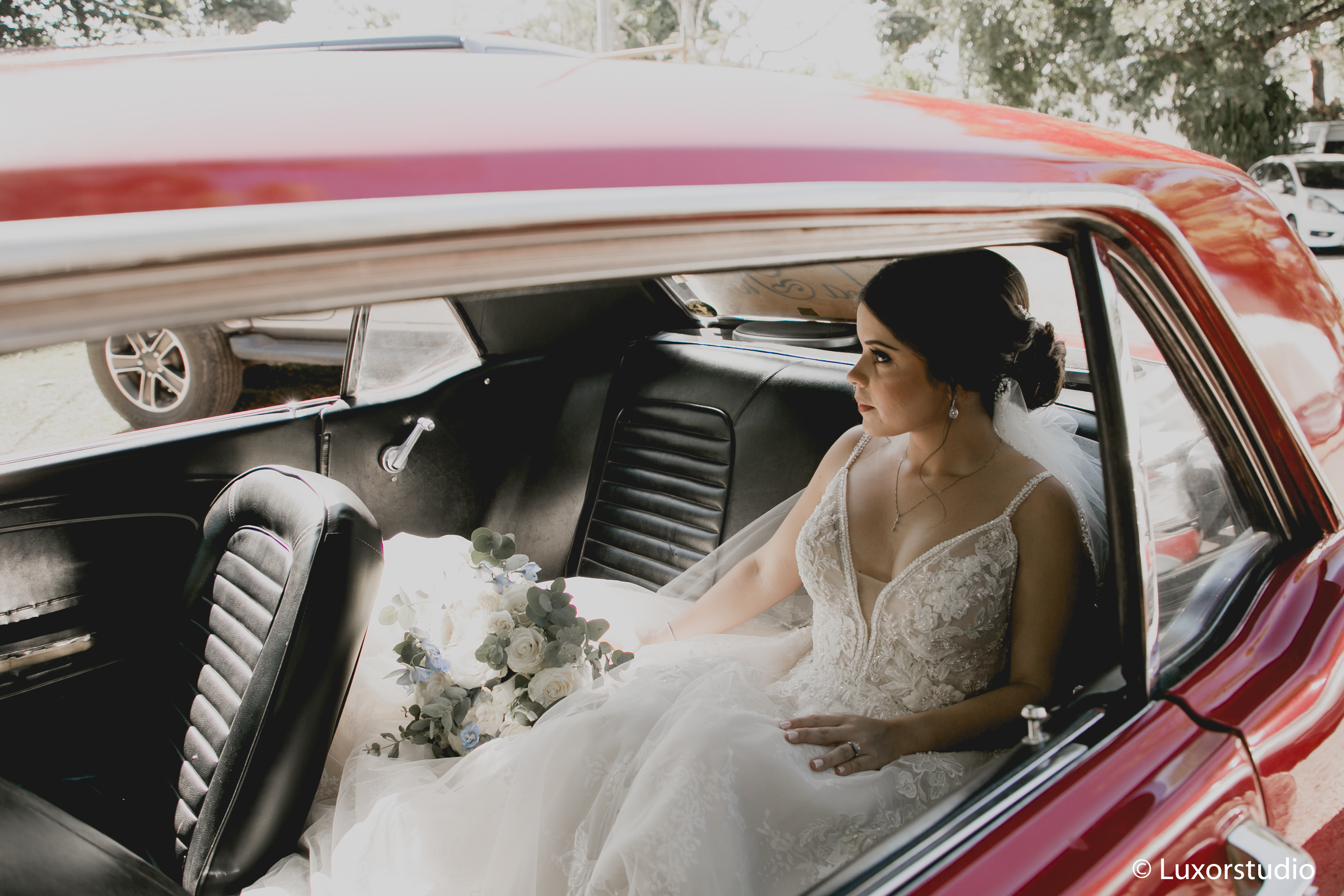 Ella llegó en un elegante auto color rojo, haciendo contraste con el blanco de su vestido. Luego del tan anhelado beso que reafirmaba su matrimonio, se dirigieron a la recepción.