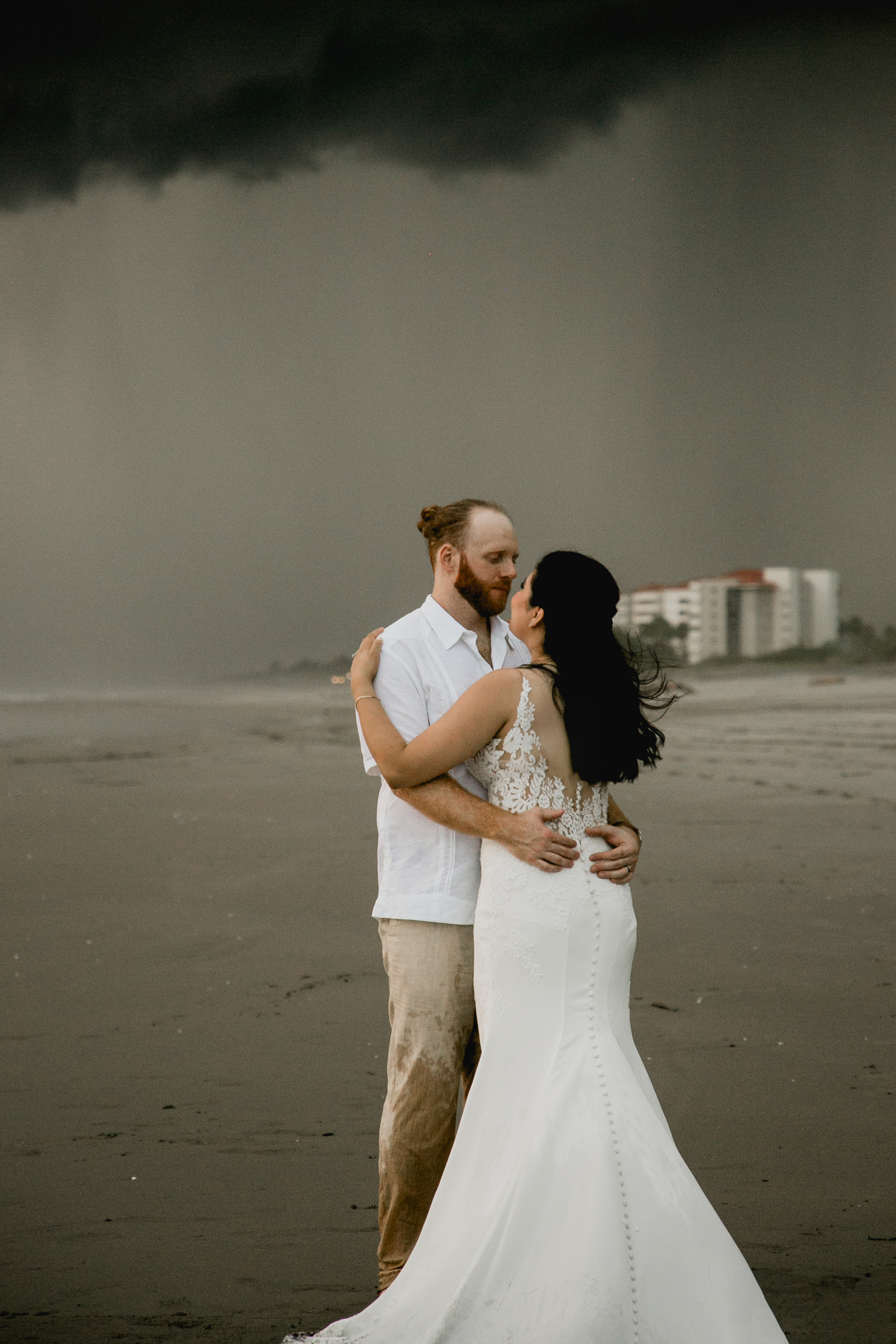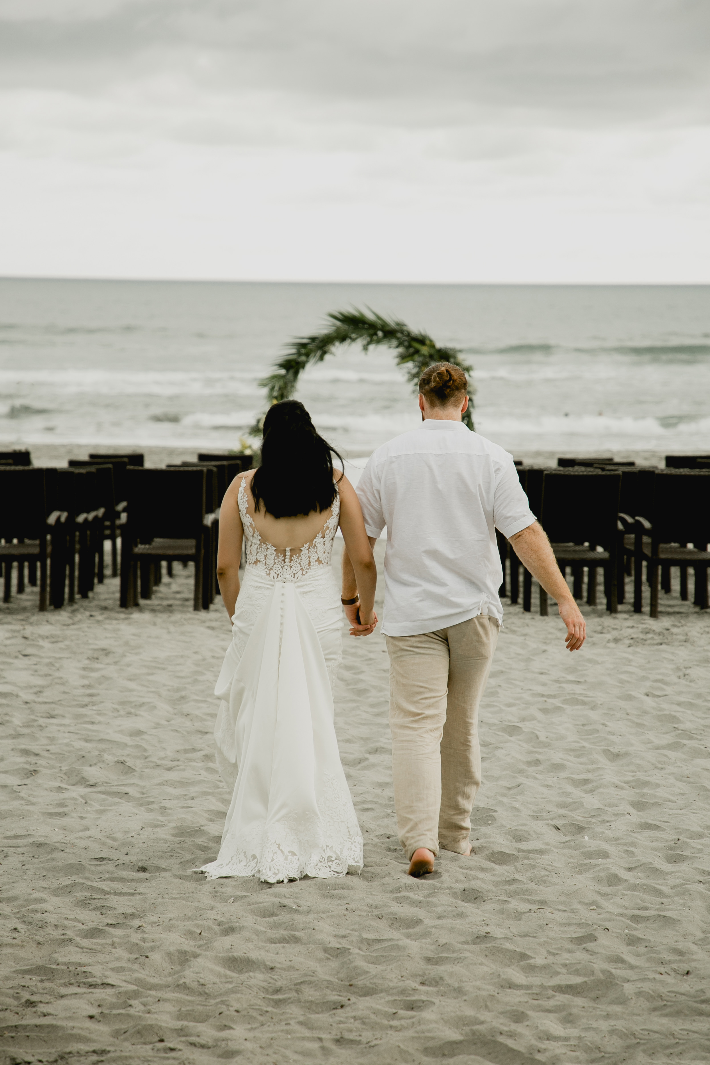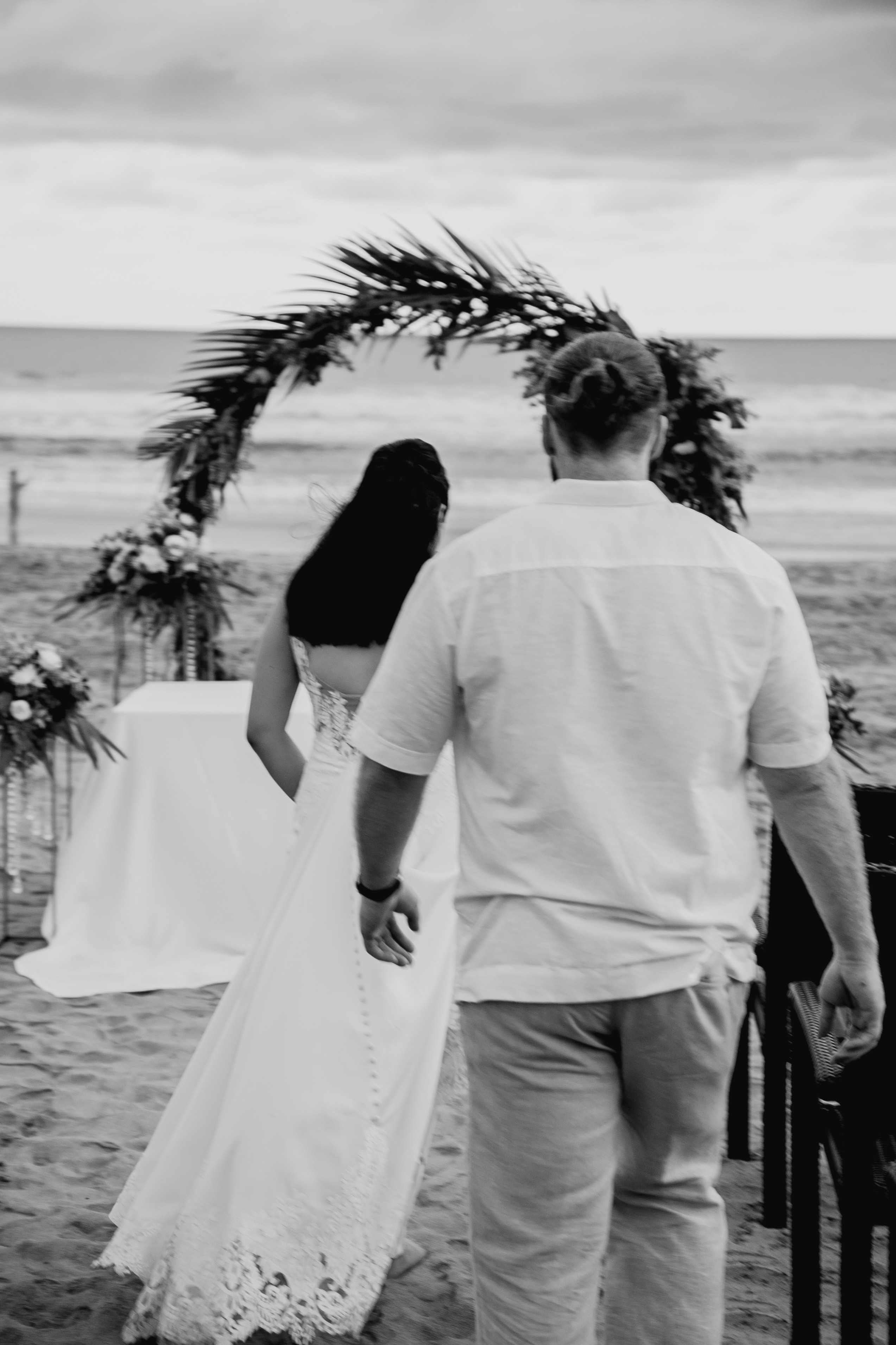 La novia se movía de forma armoniosa en contra del paisaje marino. Después de una sesión de fotos del atardecer capturada poéticamente, la pareja se condujo por la playa hacia el altar. Con beso sellaron su matrimonio.