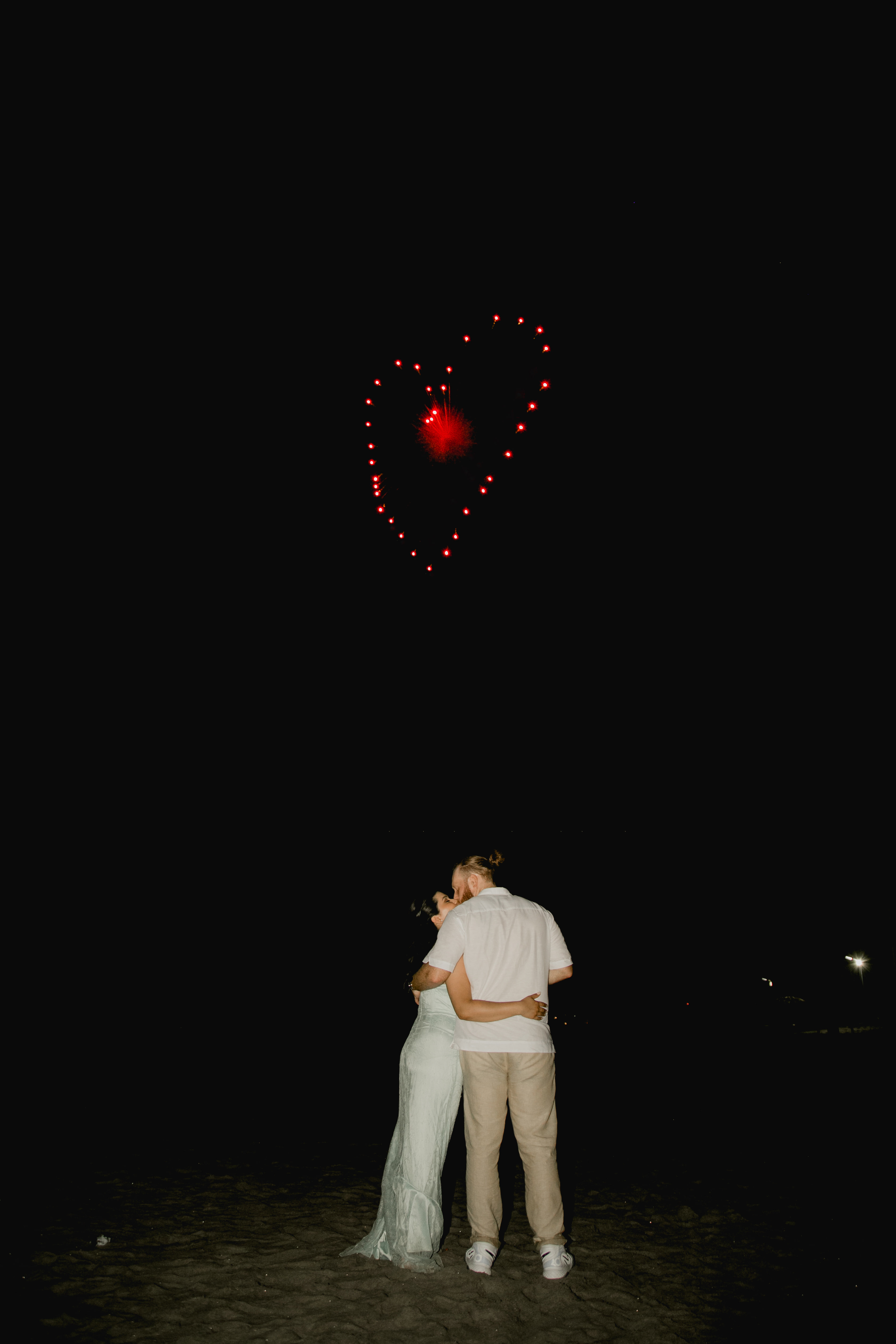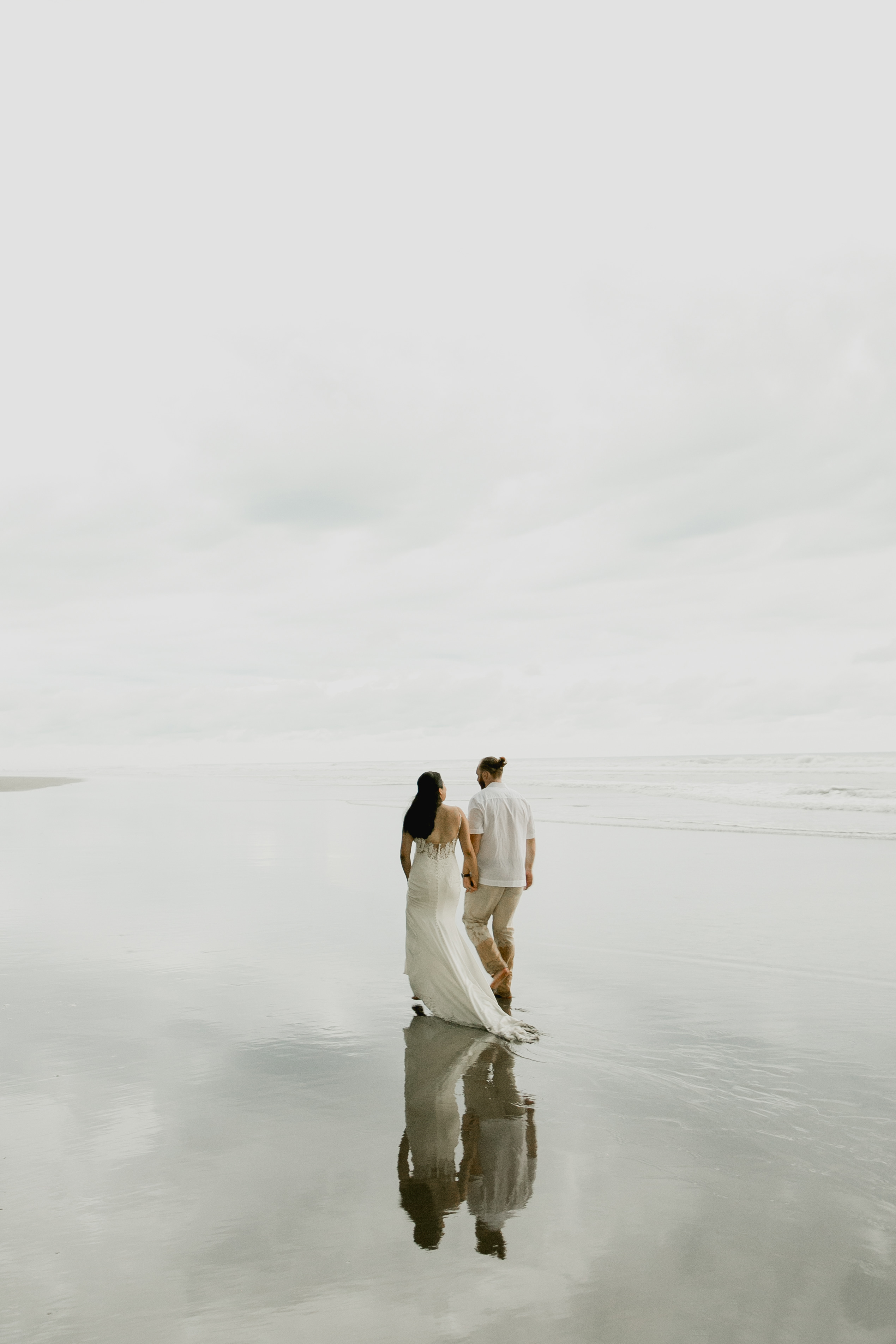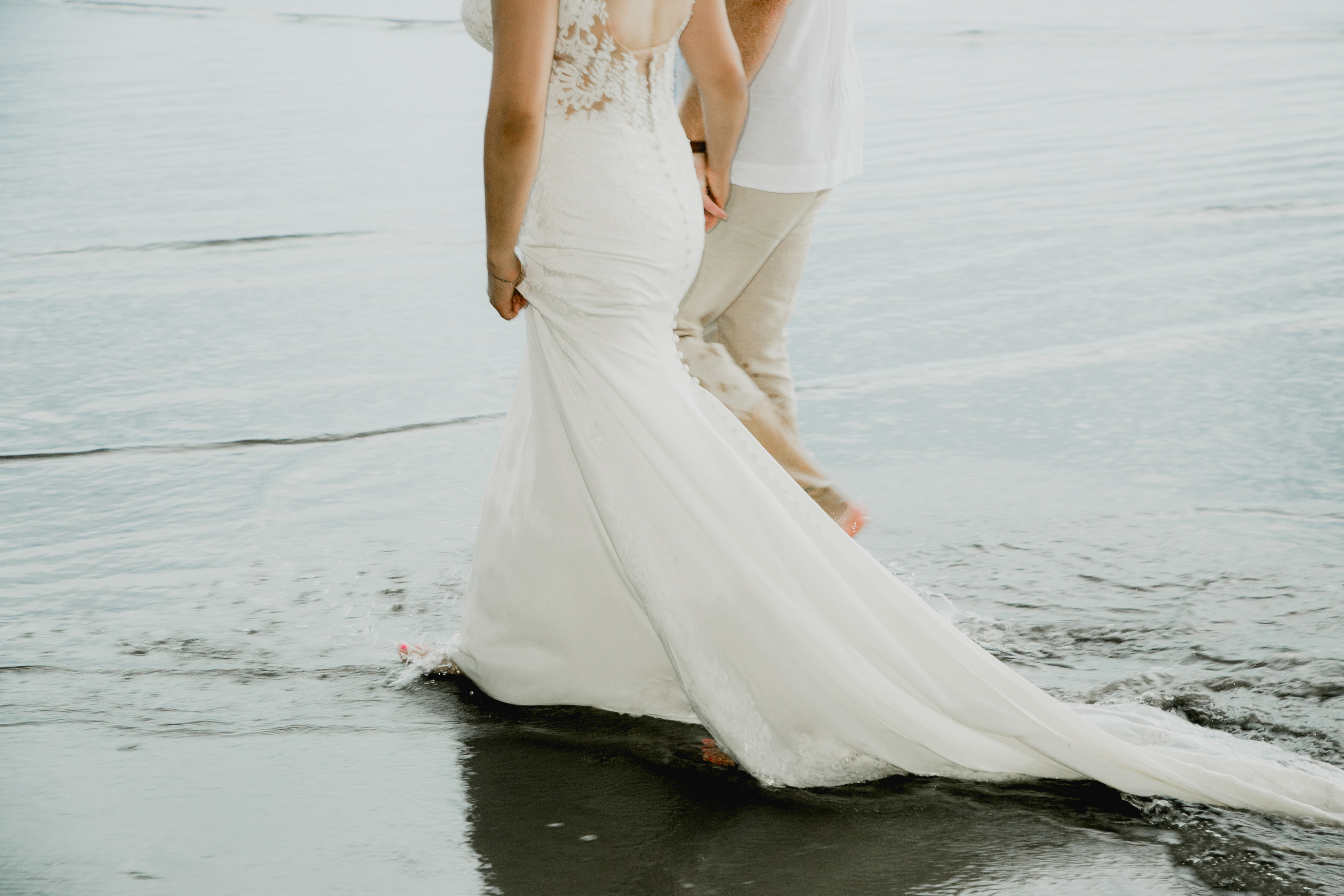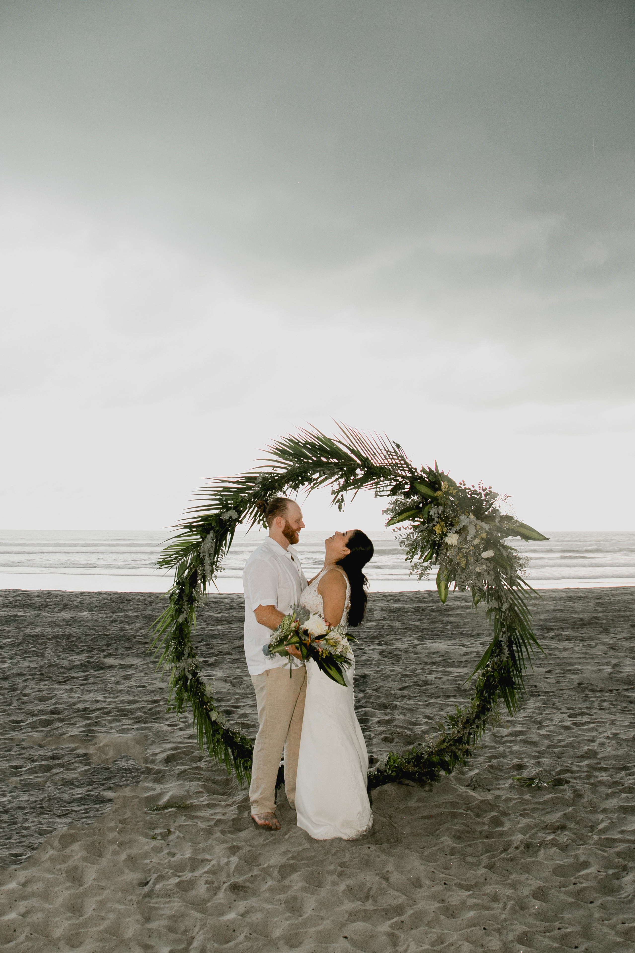 La novia se movía de forma armoniosa en contra del paisaje marino. Después de una sesión de fotos del atardecer capturada poéticamente, la pareja se condujo por la playa hacia el altar. Con beso sellaron su matrimonio.